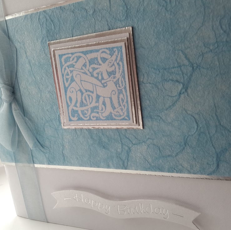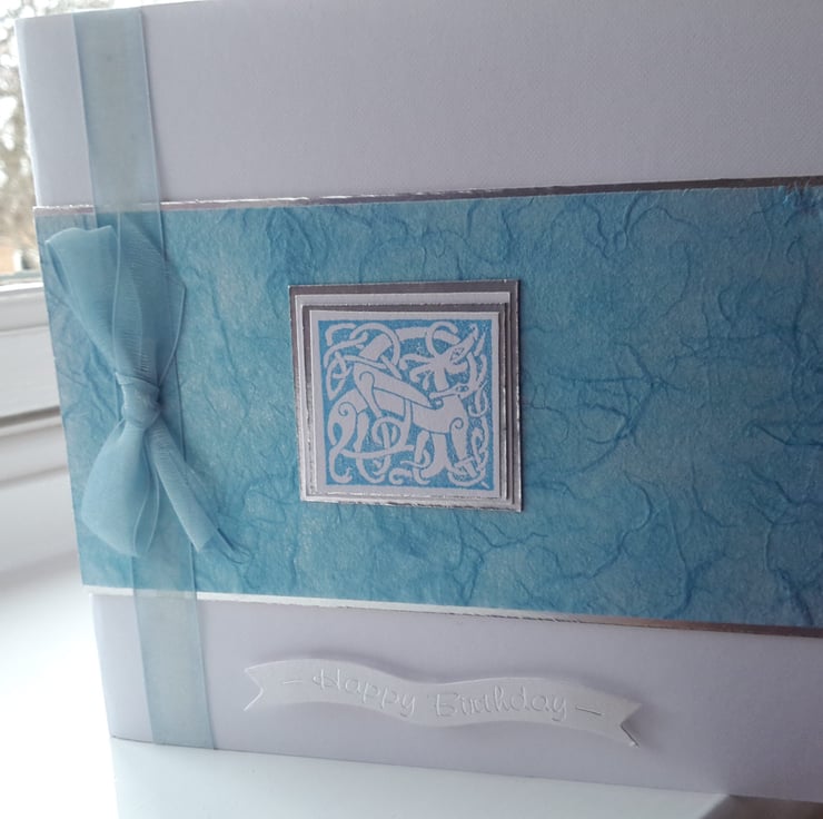 A completely handmade and uniquely designed card. Consisting of a square with Celtic design stamped and clear embossed. Mounted onto a strip of co ordinating blue mulberry paper which has been mounted onto silver Morris card a d then onto quality pristine white card. A happy birthday tag and finished off with a pale blue organza ribbon and how