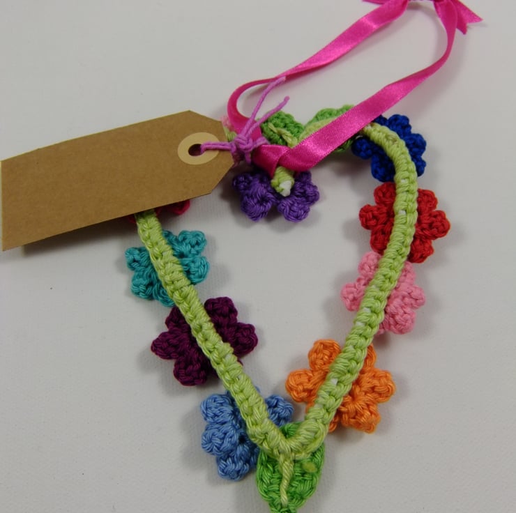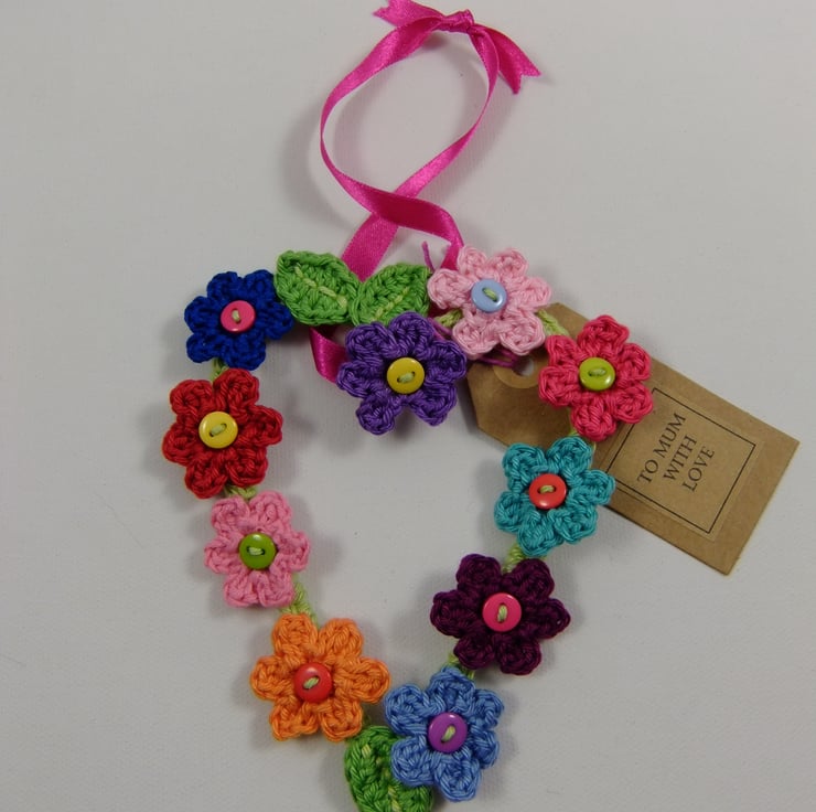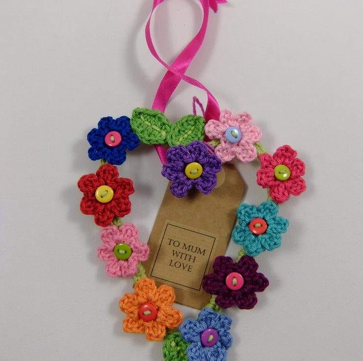 The flowers are crocheted from 10 cheerful coloured cottons and they have pretty buttons for a centre. The heart measures approximately 14 cm by 10 cm. There is a pink satin ribbon for a hanger and a tag that reads, ‘To Mum with love’ on one side and is blank on the back for your own greeting. I am very happy to exchange this tag for another one bearing a greeting of your choice.