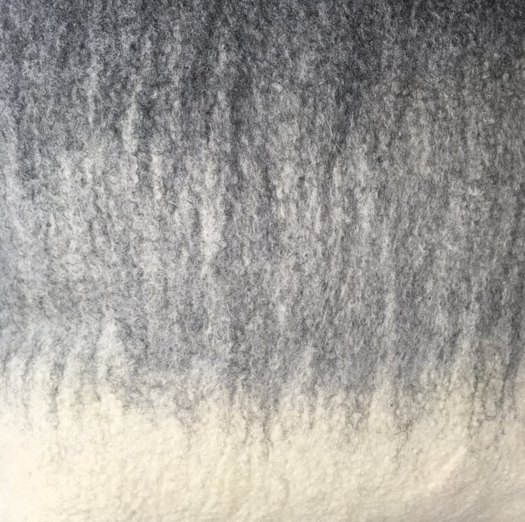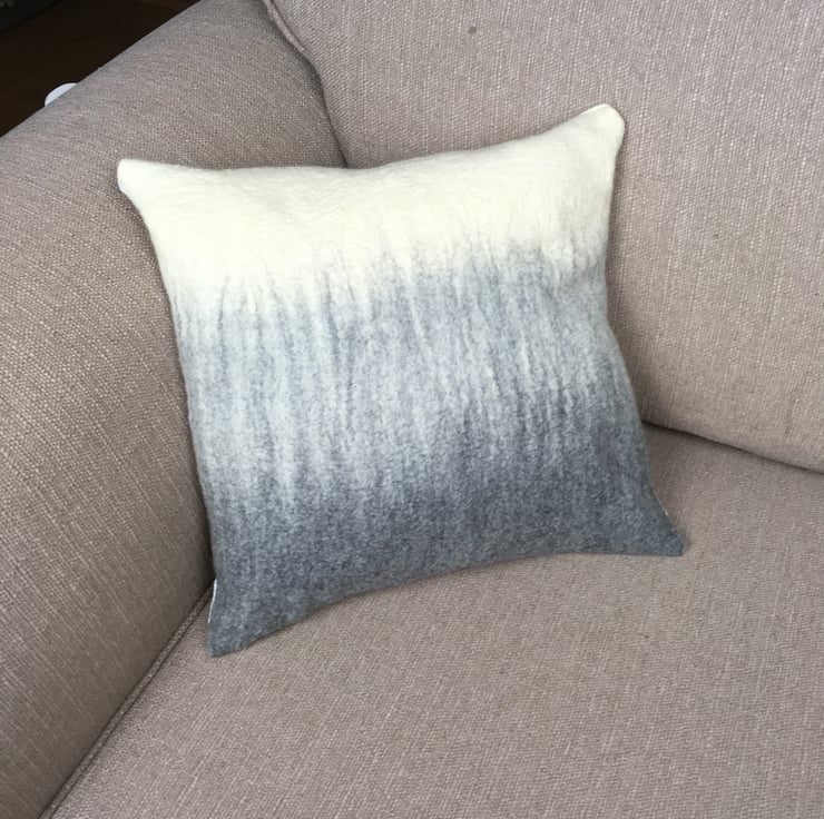 The cover has been made from a piece of hand made felt and backed using a white silk fabric. The felt has been made using grey and white merino wool fibres, blended together across the middle to produce a third shade. The cushion cover has a zip closure along one side and measures approximately 38cm x 38cm (15" x 15"). The cushion pad is included in the listing.