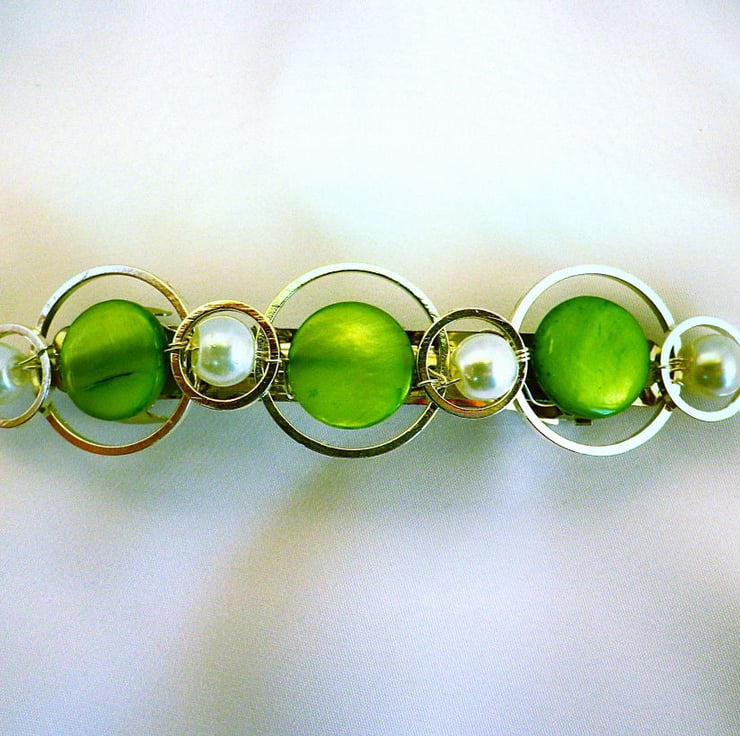 Hand crafted using silver coloured hoops, framing shimmering green mother of pearl coins. Soft white glass pearl beads complement the green, on a silver coloured clip.