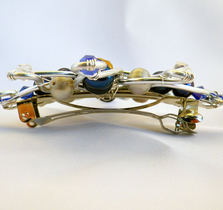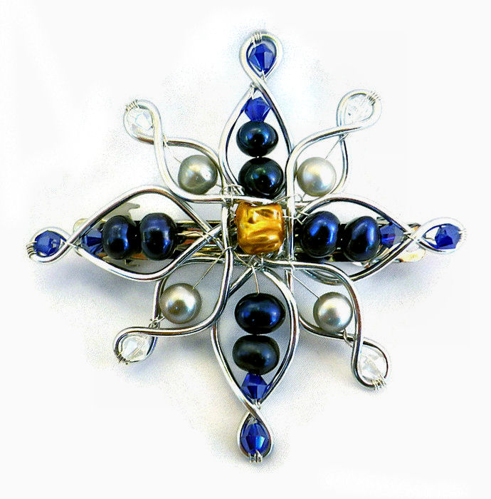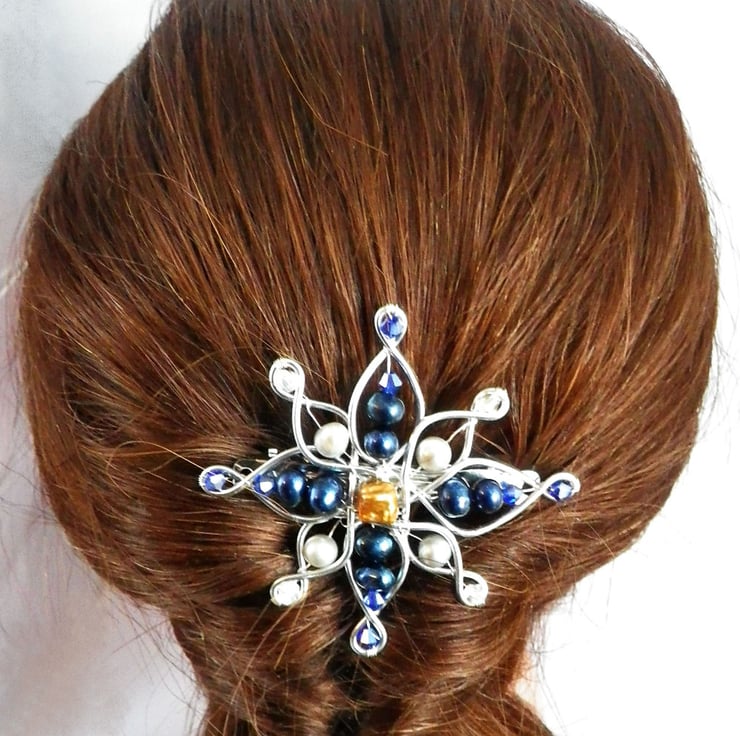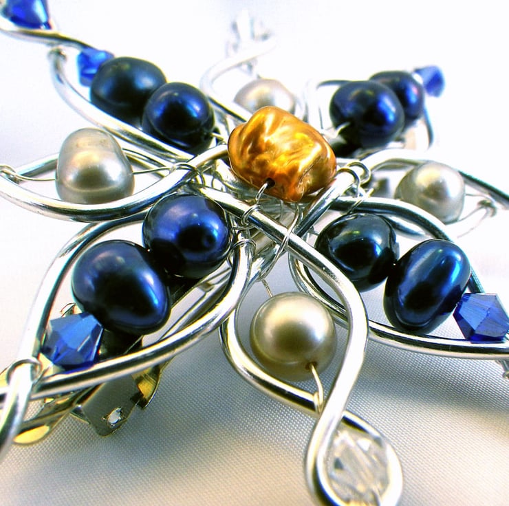 Hand crafted using silver coloured wire, hand shaped into an elegant flower, on a silver coloured clip. Rich navy blue and soft silver freshwater pearls add dimension, with an orange freshwater pearl in centre place. Crystal and blue bicone beads finish the piece with a touch of sparkle. framing shimmering green mother of pearl coins.