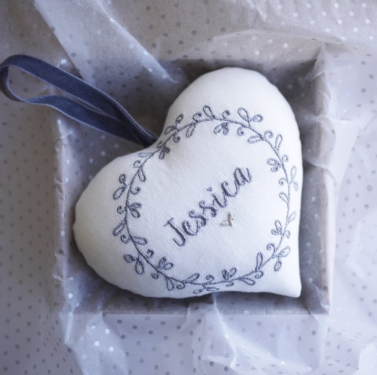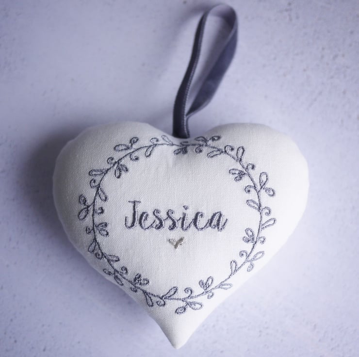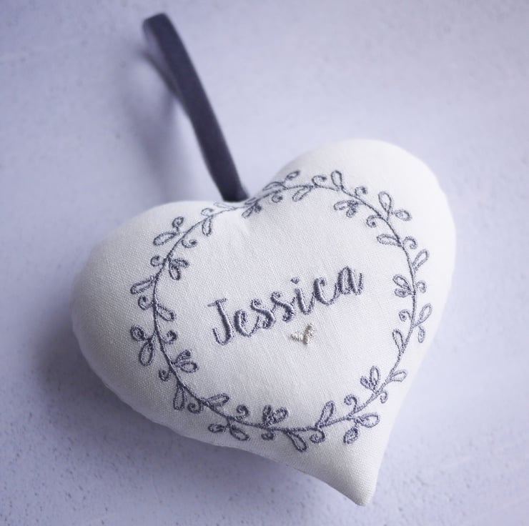 A lovely personalised handmade ivory fabric hanging heart with any name (max characters 10) embroidered in grey thread inside a pretty wreath design. Underneath the name of your choice is a pretty mini silver embroidered heart. The heart is then hung with a matching grey velvet ribbon. A perfect gift for a special friend. Please message me if you would like a different colour embroidery I have all colours available.