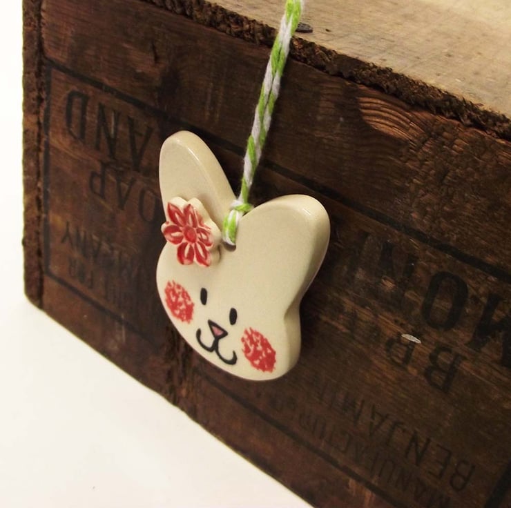 This ceramic bunny decoration is made from white earthenware clay and decorated with a little flower,