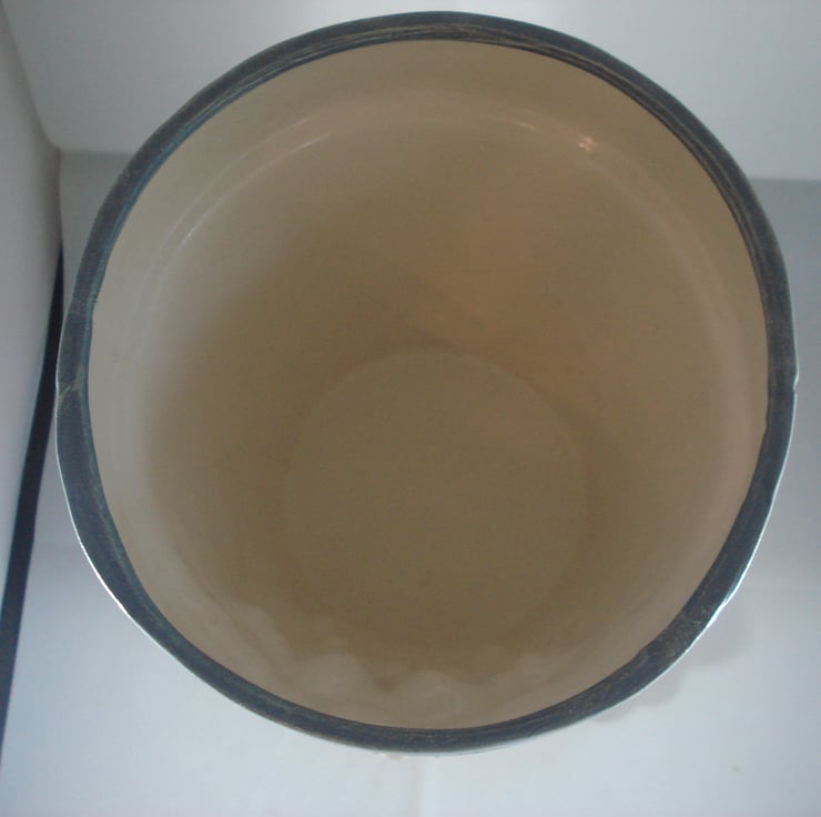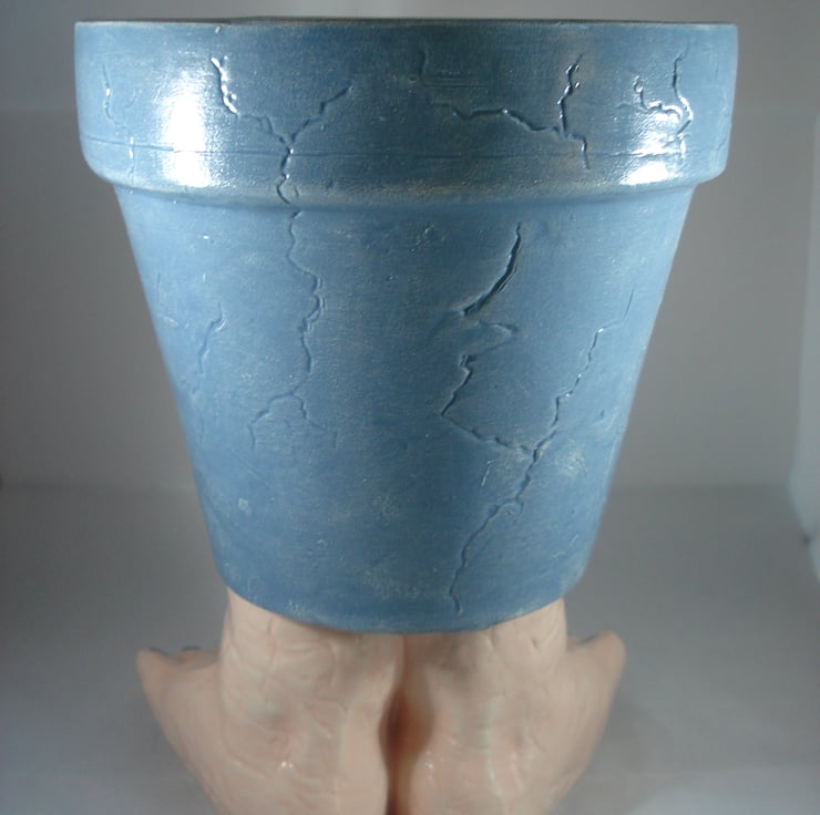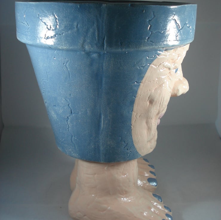 I have for sale a large ceramic novelty plant pot, which was hand painted by myself. It is in a blue colour, with a lovely smiling face on the front and standing on a pair of legs and feet. The pot has no drainage holes in the bottom, so could be used indoors or out. This would make a lovely addition to anyone's garden, patio or home or perhaps given as a gift.