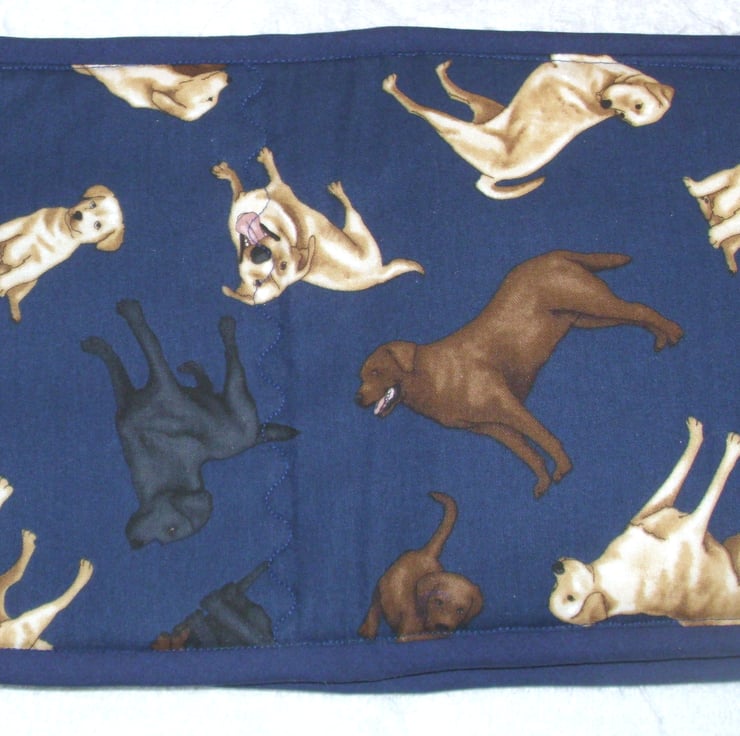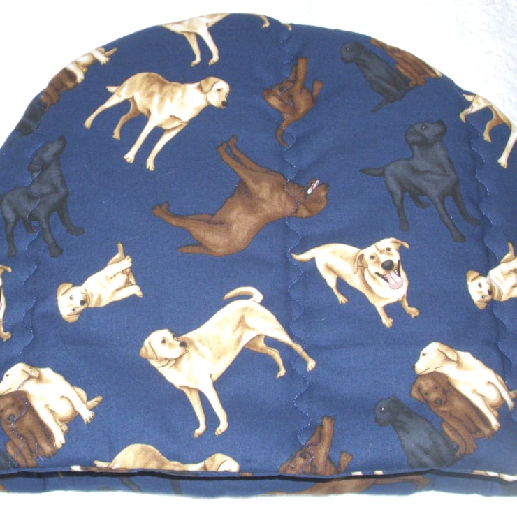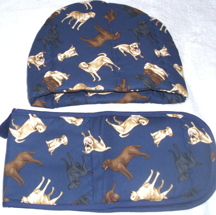 Labradors Tea Cosy and Ovengloves set with yellow labradors, chocolate labradors and black labradors tossed all over a dark blue background ,will keep tea hot for up to half an hour after you make it ,oven gloves are lined with heatproof material and are ideal to use with oven or microwave cooking, Tea cosy measures 31 cm wide and 25 cm high . fully washable .