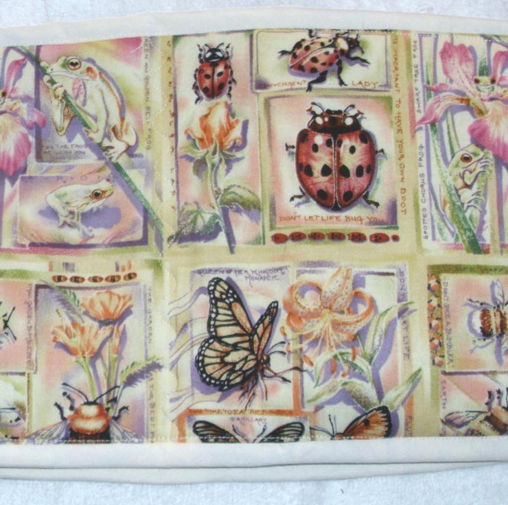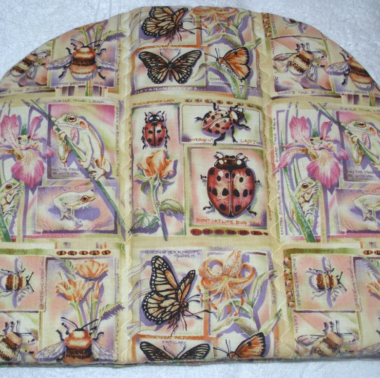 Butterflies, Bugs and Bees Tea Cosy and Ovengloves set with butterflies, ladybirds, bees and frogs among flowers with little sayings around some of the designs, on a pale yellow background ,will keep tea hot for up to half an hour after you make it ,oven gloves are lined with heatproof material and are ideal to use with oven or microwave cooking, Tea cosy measures 31 cm wide and 25 cm high . fully washable .