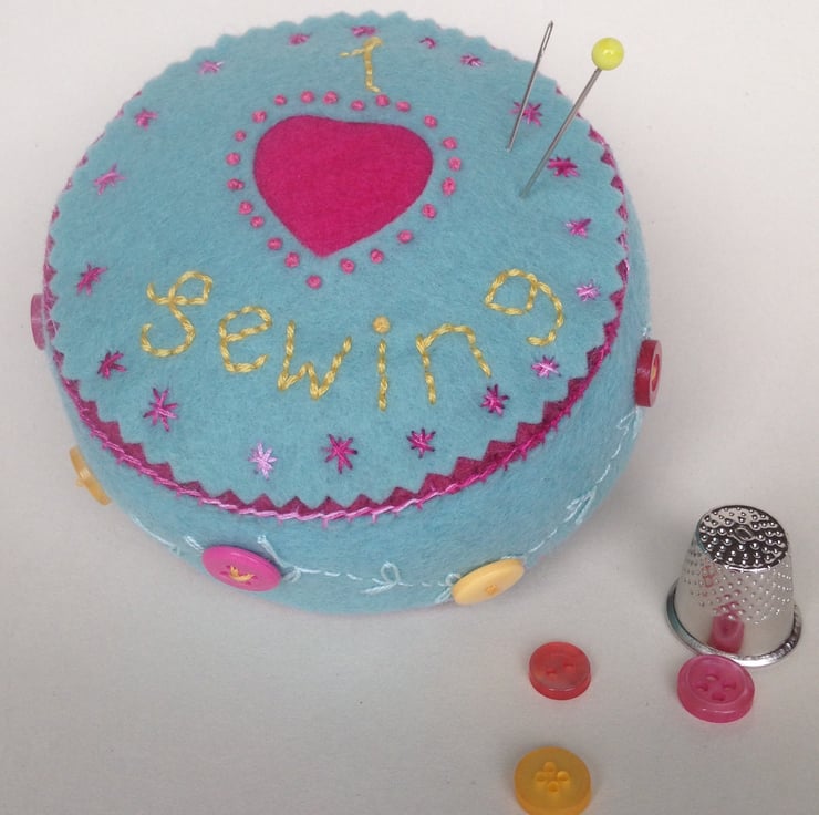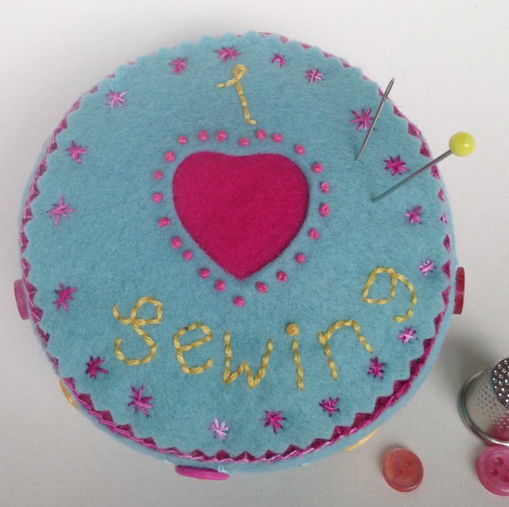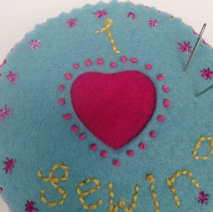 This pincushion measures 9cm in diameter and is 5 cm thick so it will hold lots of pins and needles. The top is decorated with a reverse applique heart edged with French knots and embroidered lettering and stars. The edge is decorated with buttons and embroidery. It is made from wool felt and is stuffed with toy stuffing.
