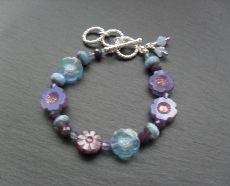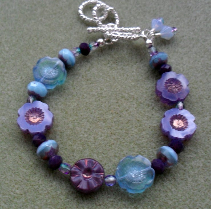 Czech glass flower beads, Czech fire polish beads which add a little sparkle are attached to a silver plated copper toggle clasp