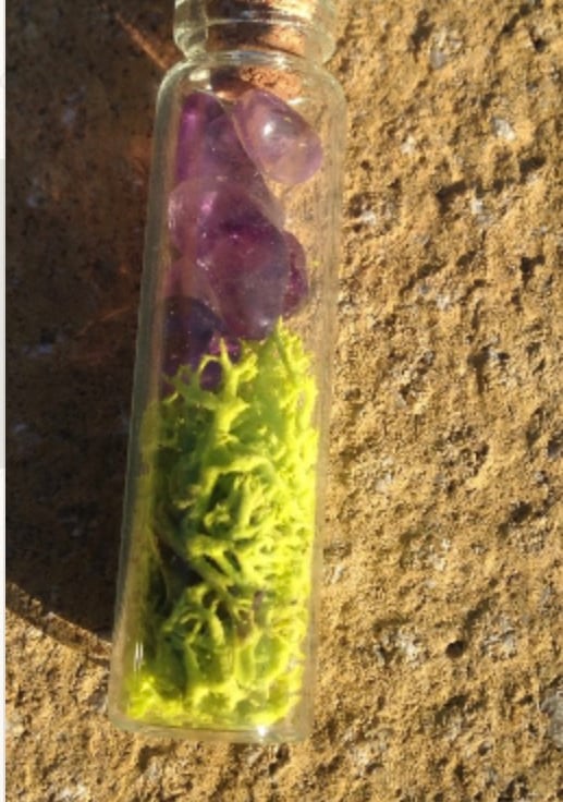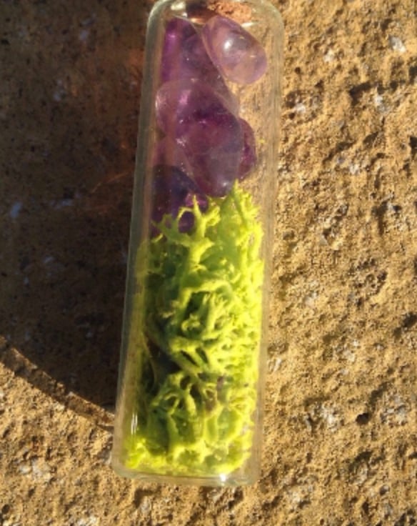The vial measures approx 2.5 inches and is filled with moss on the bottom and pieces of Amethyst at the top and is sealed.