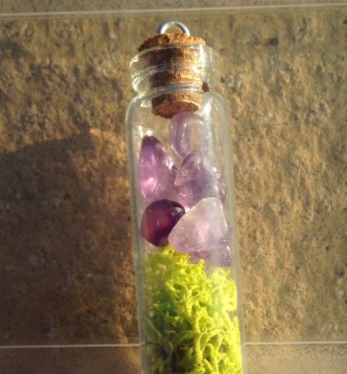 This listing is for a amethyst and moss glass vial bottle necklace.