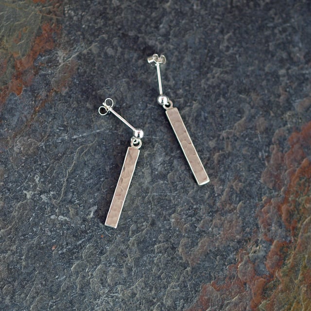 These simple everyday earrings have been handmade in sterling silver. Their bar shaped drops have been given a hammered texture to give an extra shimmery artisan style element.