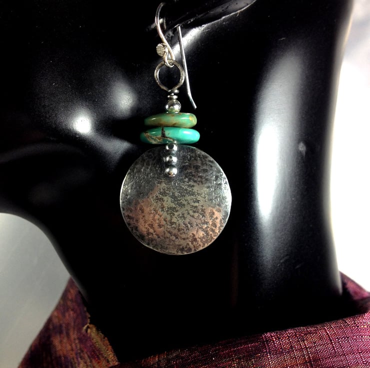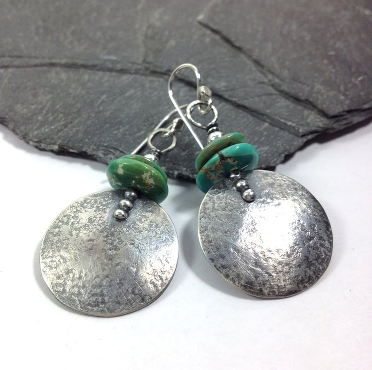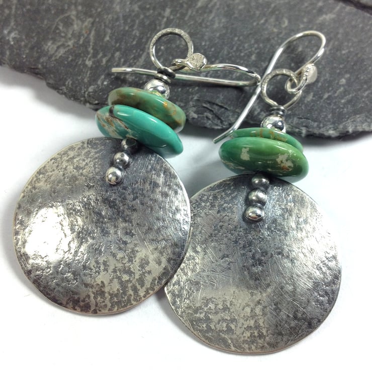 Beaten dished discs of silver have been topped with irregular turquoise washer beads and hung from handmade hooks.