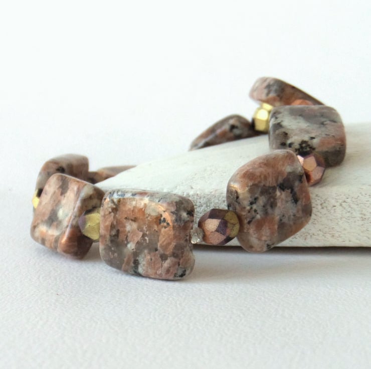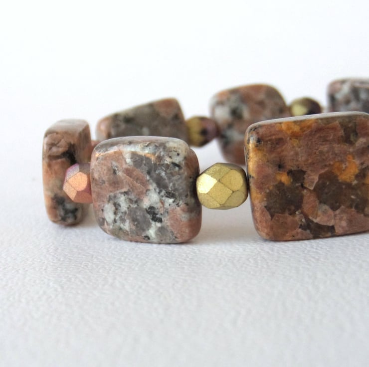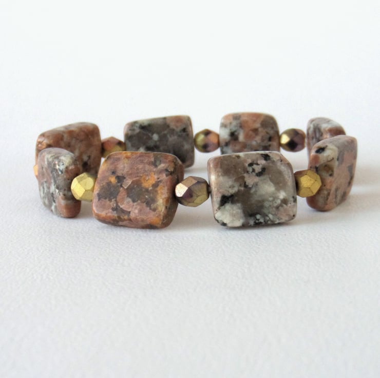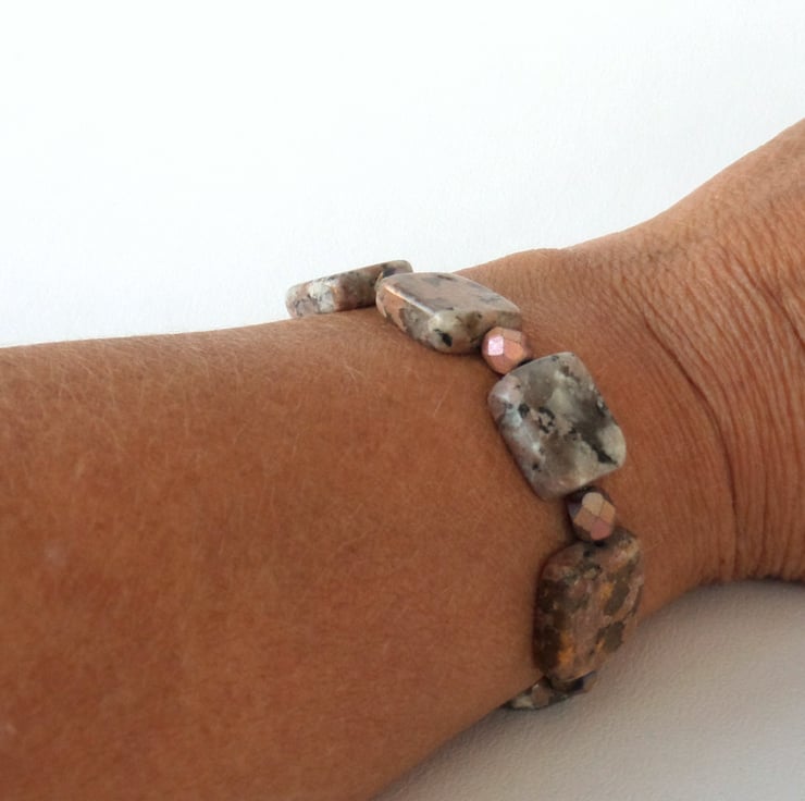 A stretchy bracelet, made with unusual and very attractive jasper squares and crystal beads.