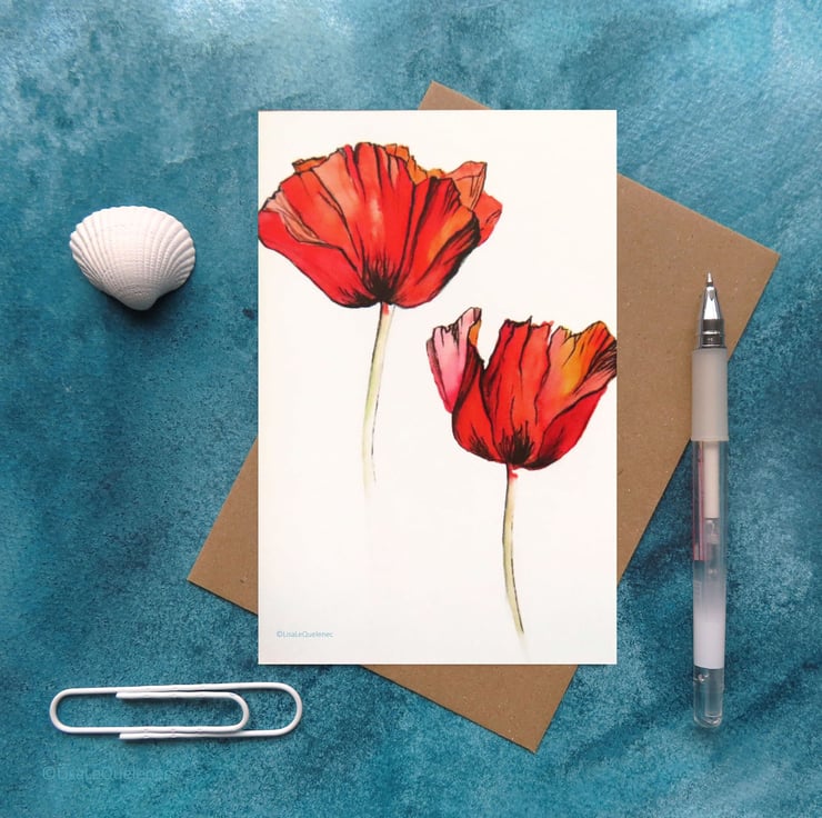 A greeting card featuring two poppy blooms, a study of oriental poppies from my garden painted in acrylic ink and reproduced into blank greeting cards measuring 6x4 inch (10x15.5cm).