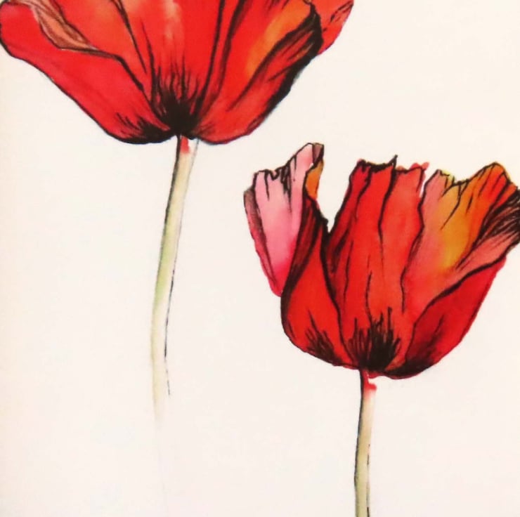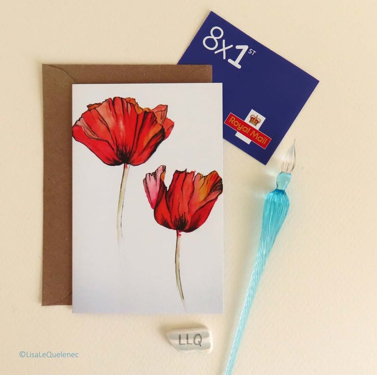 A greeting card featuring two poppy blooms, a study of oriental poppies from my garden painted in acrylic ink and reproduced into blank greeting cards measuring 6x4 inch (10x15.5cm).
