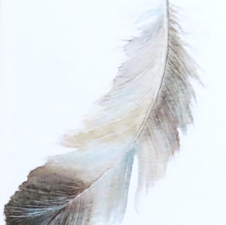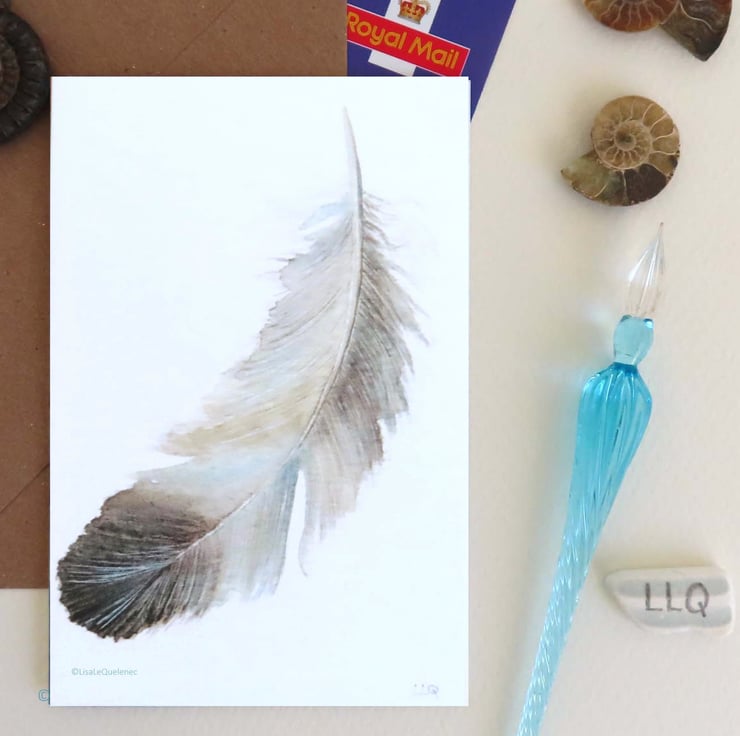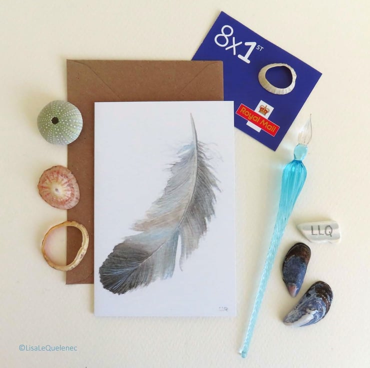 Taken from a study of a delicate grey feather on a white background painted in watercolour and reproduced into blank greeting cards measuring 6x4 inch (10x15.5cm).