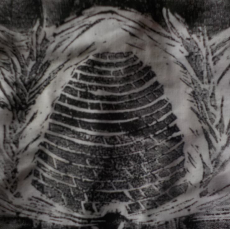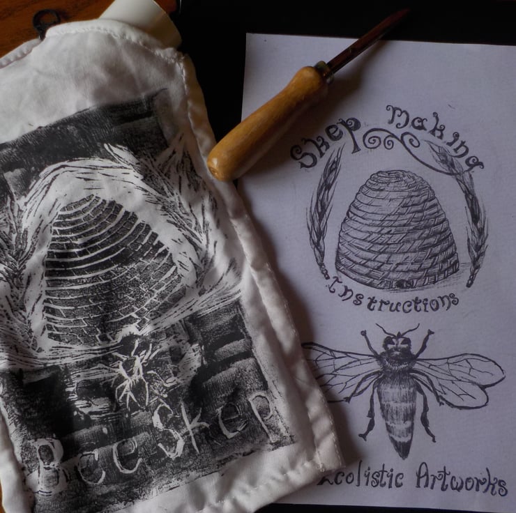 Ecolistic Artworks original design hand printed lino up-cycled cotton handmade bag and skep maker's tool and gauge.