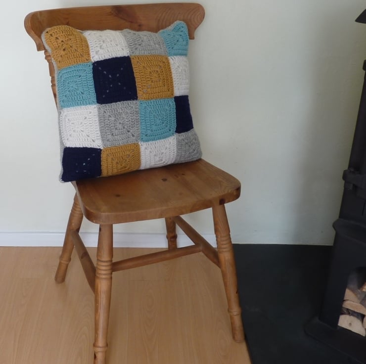 I have designed and crocheted this cushion cover ( US pillow) in lovely nautical shades of white , navy blue, aqua blue, mustard and pearl grey , using a 100% wool yarn ( super-wash for easy care ) .Five, pretty, Mother of Pearl buttons have been sewn to the top , which act as closures. The back is a single square panel ( in pearl grey ). A lovely , snuggly addition to your home .