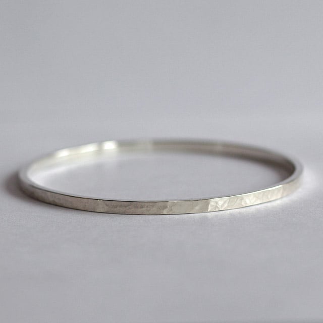 This bangle has been handmade by hammering a strip of 3.2mm x 1.6mm thick, recycled sterling silver and soldering together the ends to create a circle that forms the bangle.