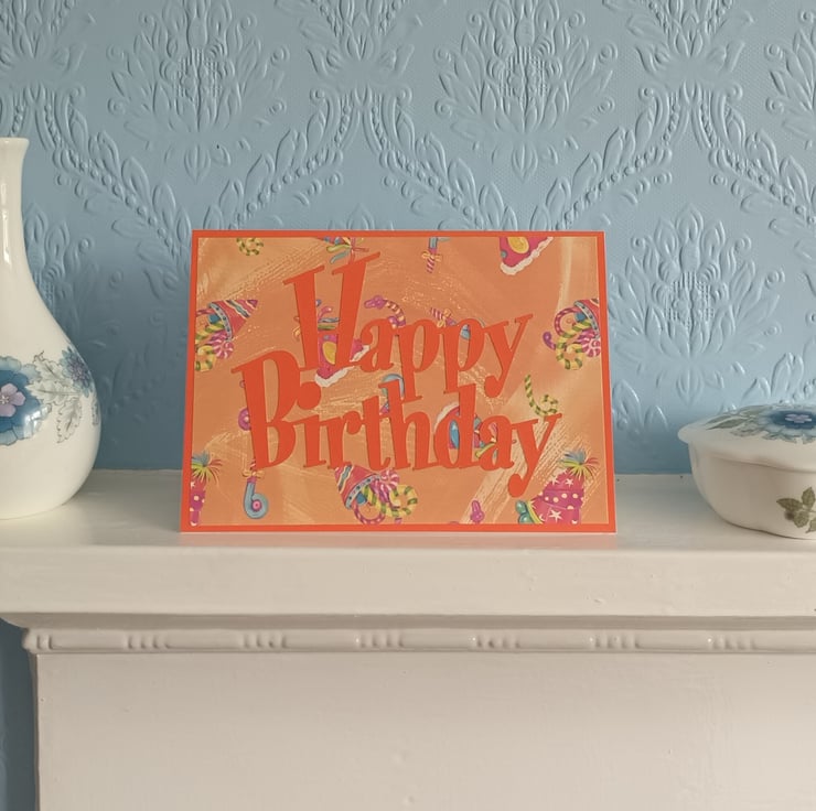 I have used orange paper with a party hat and candy cone design and bordered this with orange pearlescent card. I have added a die cut "Happy Birthday" sentiment in the same pearlescent card to finish.