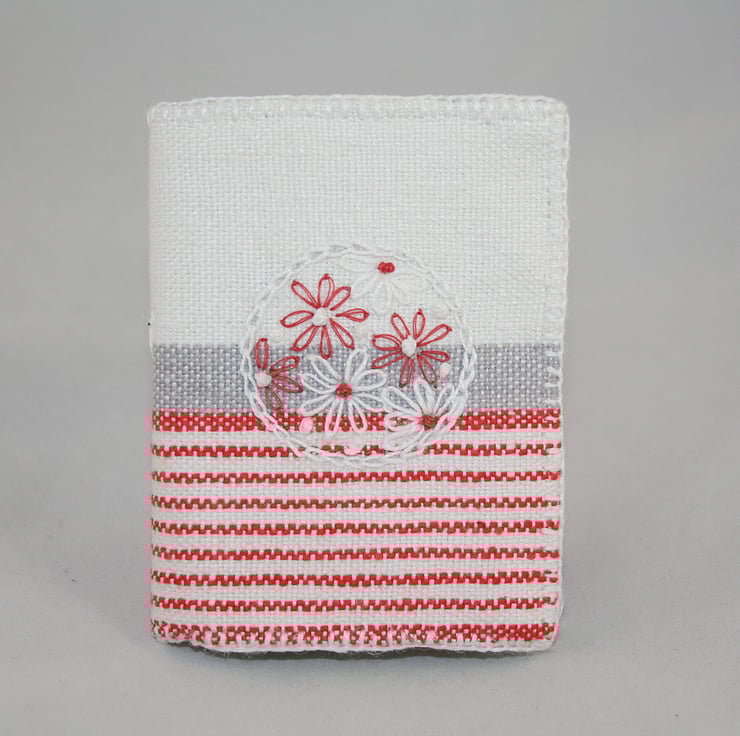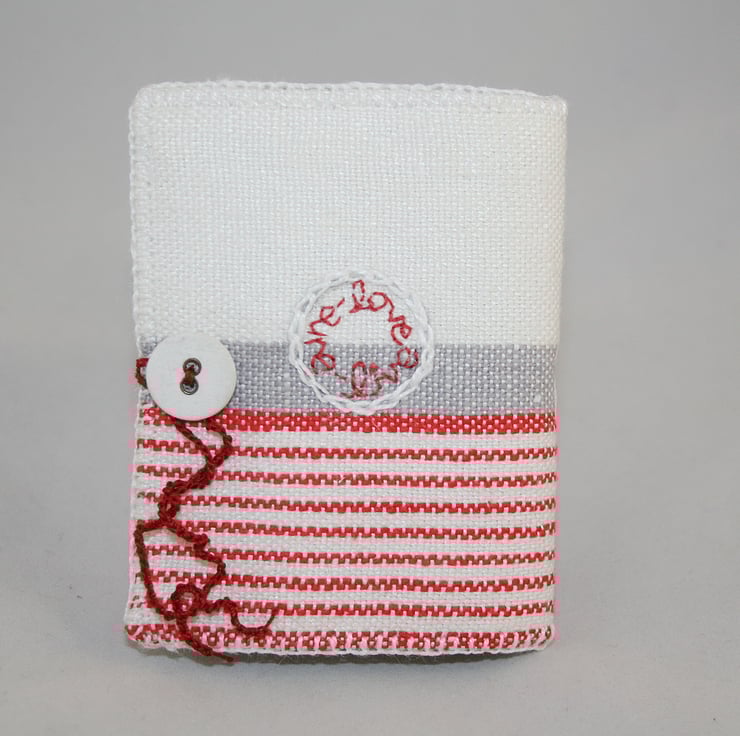 I loved the texture and bold stripes of a vintage, red and white tea towel which showed no signs of use. Cut so that the stripes are pleasingly placed, it has provided fabric for the cover of this needle book. A simple circular motif has been hand-embroidered onto the front of the cover using matching white and red threads. On the reverse of the needlebook the sentiment 're-love re-live' has been hand embroidered in a circular motif in the same red and white threads. The cover is finished by an edging of blanket stitch in white thread.