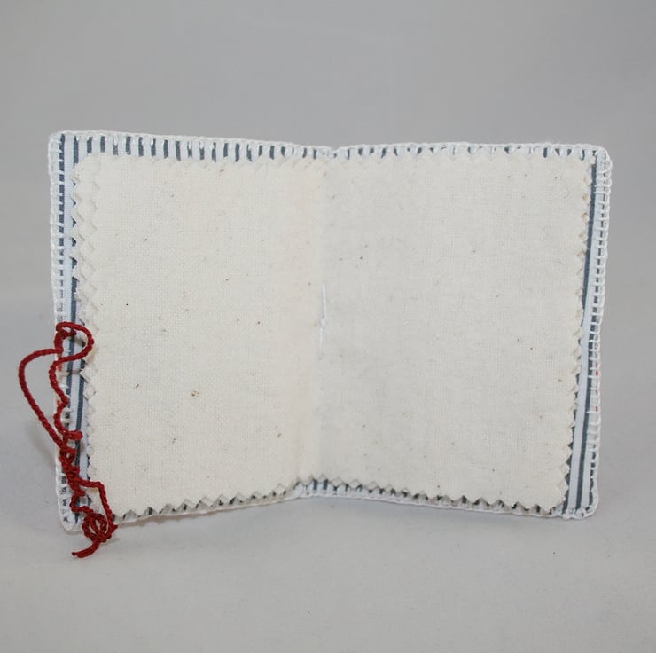 The needle book is lined in a grey and white striped fabric. The cover is stiffened by two layers of interfacing. Two pieces of vintage soft flannelette are folded and securely stitched in place, to provide four 'pages' for your needles and pins. The needle case closes by winding two red 'cords' (produced from crocheted thread), in opposing directions around a lovely vintage, linen-covered, laundry button.