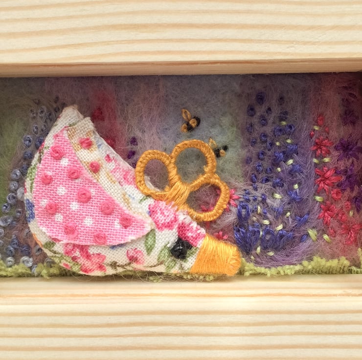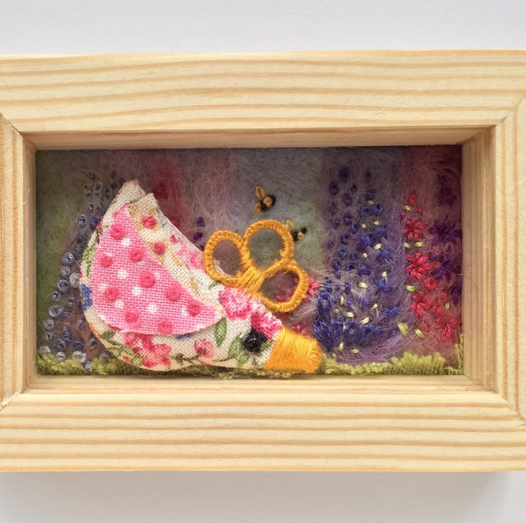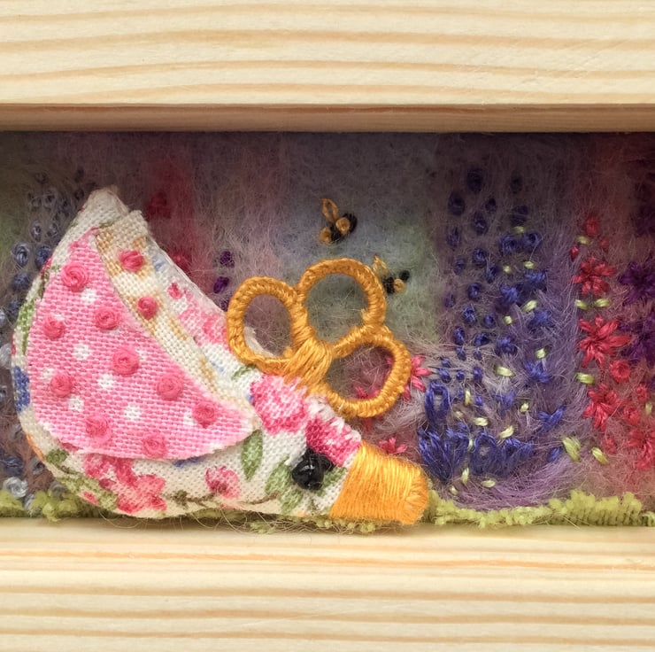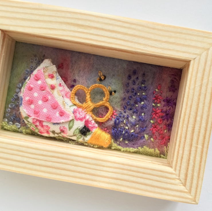 Chelsea the chick likes nothing more than a lovely stroll around the foxgloves and delphiniums. This tiny textile piece has been made using needle felting and hand embroidery. I have used a variety of stitches including french knots and lazy daisy for the cottage garden of flowers surrounding this miniature chick.