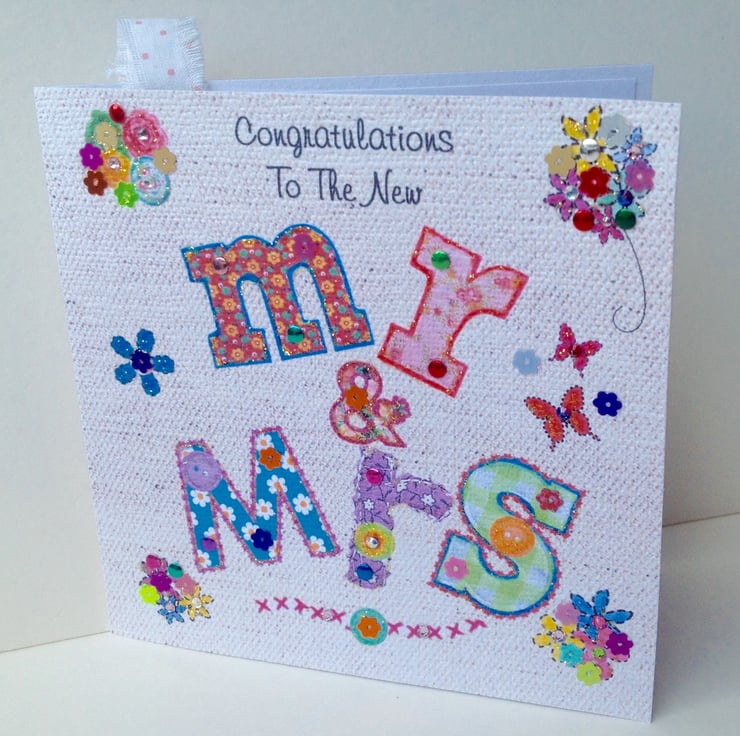 The Applique work is the main design as it spells out the 'Mr & Mrs', with smaller text for the remainder of the greeting.