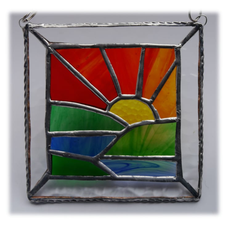 The sun's rays are made from 5 different colours and textures of red and amber glass and the sun is a bright yellow. The fields are in 3 different types of green glass and the sea in 2, streaky and bright textured blue.