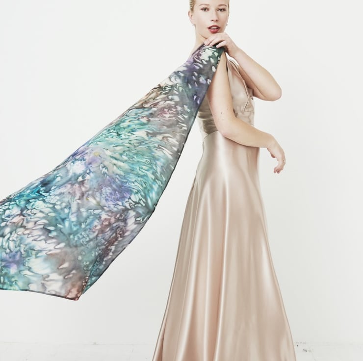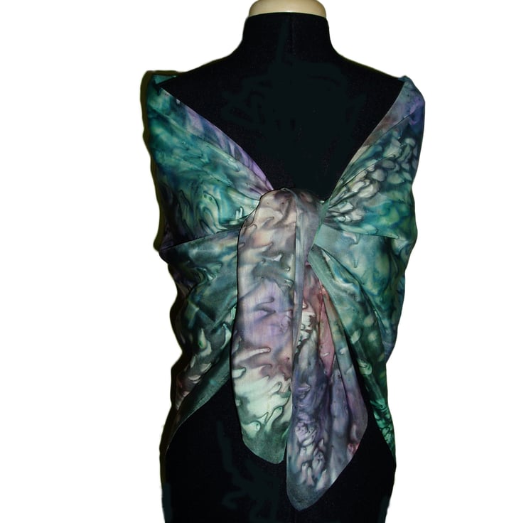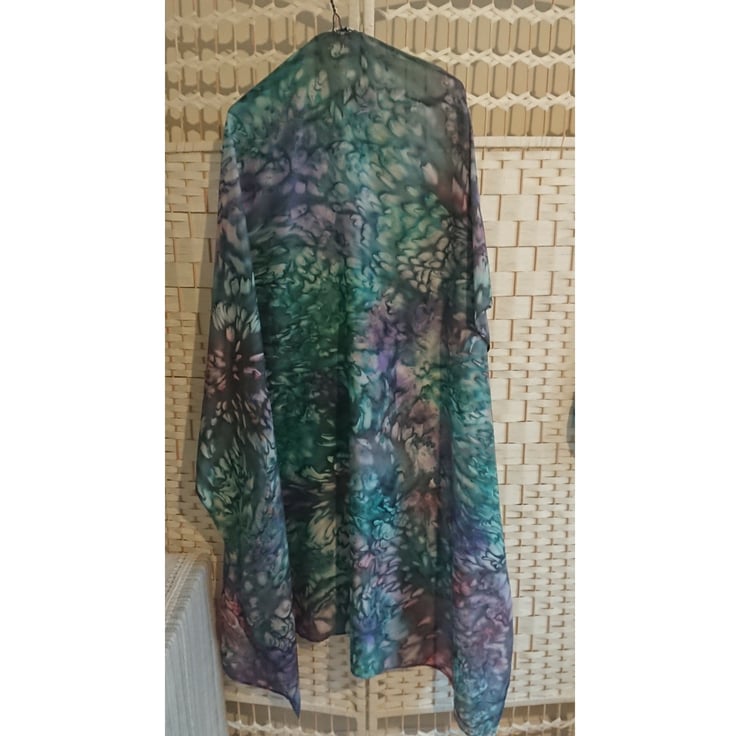 100% silk habotai handmade scarf measures approximately 112 x 112 cm (44 in) square. The edges of this handpainted silk scarf are hand finished and this is a one off multicolour silk scarf in particular as the free flowing style of painting cannot be duplicated.