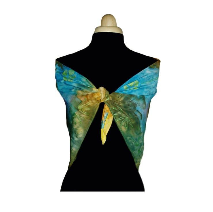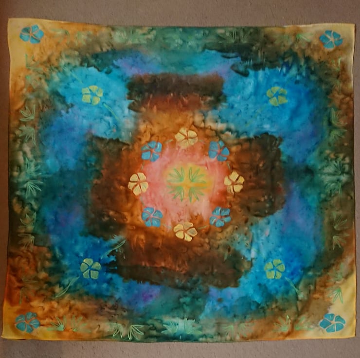 This artist silk scarf can be worn as a headscarf, an evening wrap, a stole, worn to a party or a celebration, or just as a luxury silk scarf to brighten the day, wear it with plain colours or mix with other colours or patterned fabrics for a contemporary style.