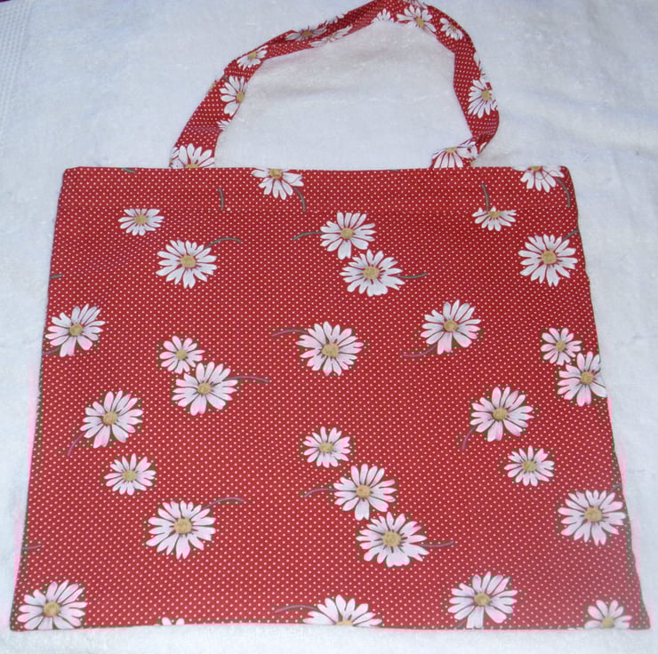 Bright white daisies on a red and white spot cloth shopping bag , very comfortable to carry with fabric handles , ideal for carrying shopping .also useful as an overnight bag for all those essential items or as hand luggage when travelling , will hold for example : a wash bag , make up bag , a book . it measures approx 42.5 cm x 40cm .