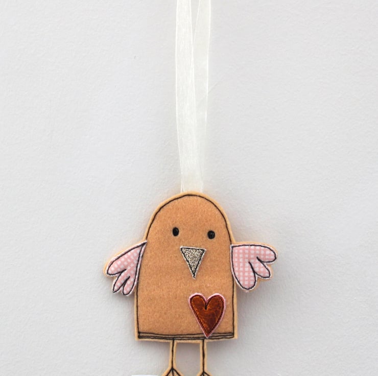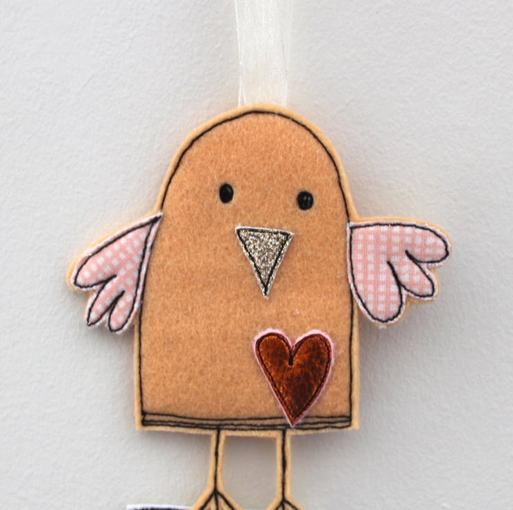 A pale orange chick, is sewn using 100% wool felt, with an orange coloured metallic heart, cotton wings, glitter fabric beak and a sewn fabric label 'cheep cheep'.