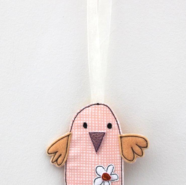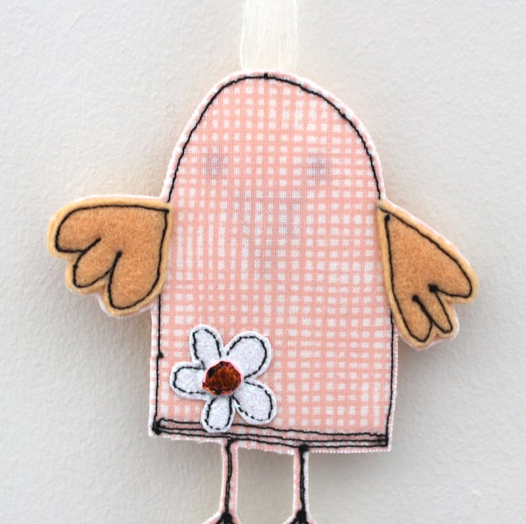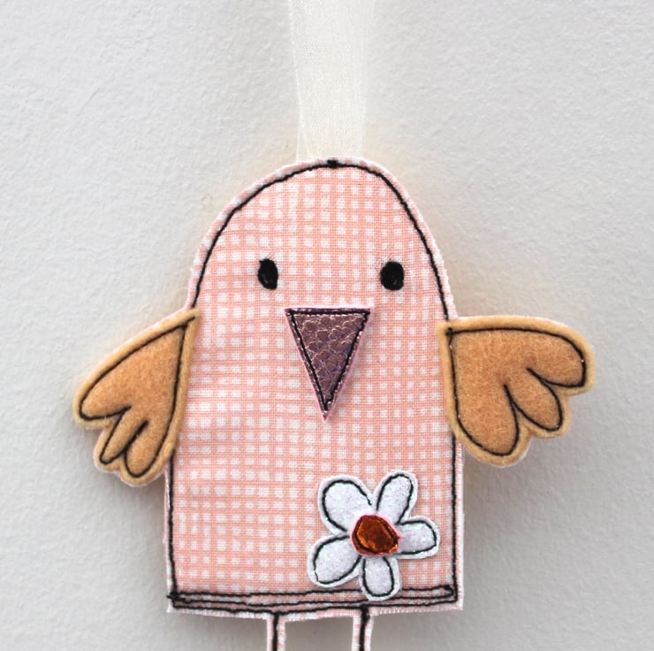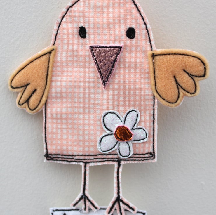 A pale orange chick, is sewn using printed cross hatched cotton cloth, with a glitter flower, 100% wool felt wings, metallic beak and a sewn fabric label 'cheep cheep'.