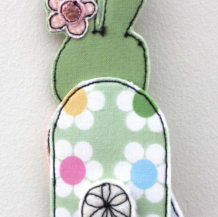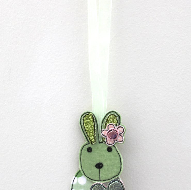 A floral fabric bunny, is sewn using cotton cloth, with a green metallic heart, glitter ears, 100% wool felt tail and a sewn 100% wool felt label 'Happy Easter'.