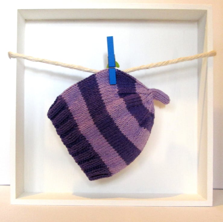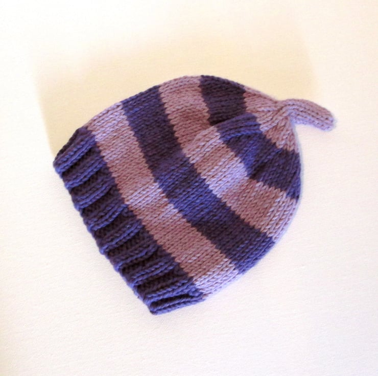This stripy Purple and Lilac baby beanie hat is hand knitted in a soft 100 per cent pure cotton, it has a decorative stalk on the top and a ribbed brim and is for an age 3 to 6 month baby.