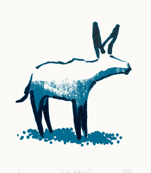 This is a screen print entitled 'Donkey Portrait No.3' printed in dark blue and light/mid blue.