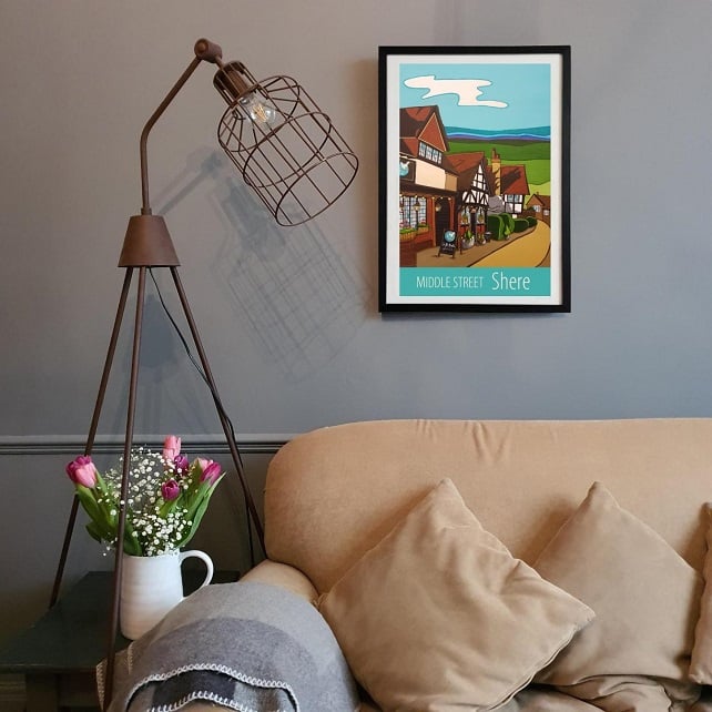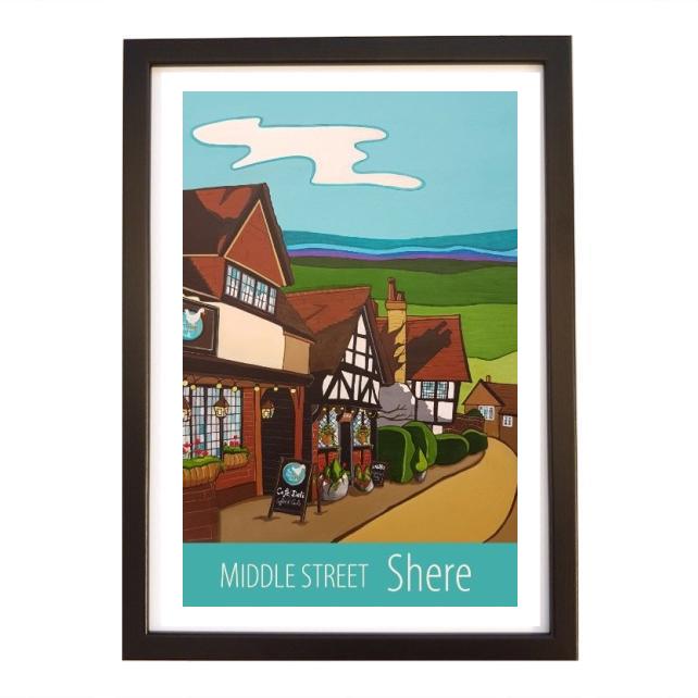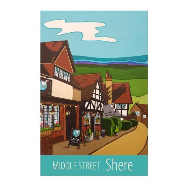 A contemporary travel poster style print of Middle Street in the picturesque village of Shere, Surrey, from my own original acrylic painting.