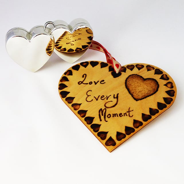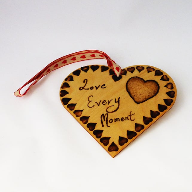 A lovely wooden hanging heart, with a pyrography heart design and the words ‘Love every moment’.