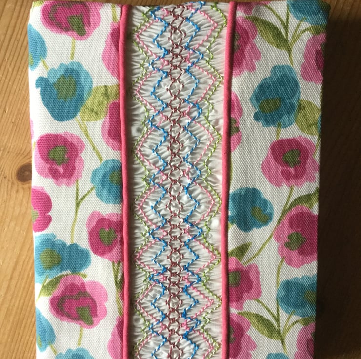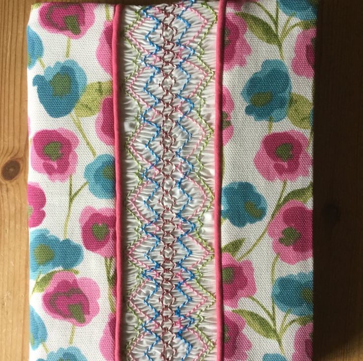 This useful journal is covered in a fabric slip cover which features an inserted strip of smocking which has been worked in toning colours and is edged with pink piping.