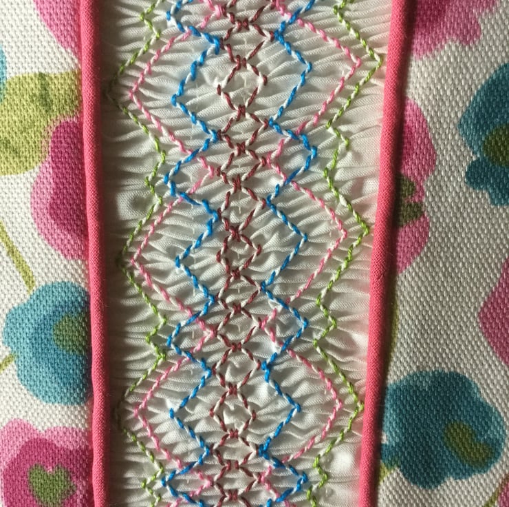 The smocking is worked on a narrow band of white fabric and the pattern worked as the mood takes and in response to the fabric, so will not be repeated.