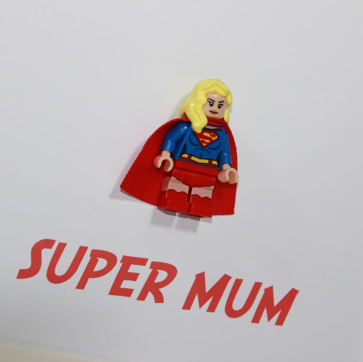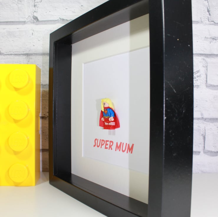 Here we present our fabulous Supergirl minifigure - she has been mounted in to a deep box frame and comes complete with the wording Super Mum written underneath in a suitable comic book style font. We can also do this as a "Super Mummy" frame if you prefer - just let us know which one you require.
