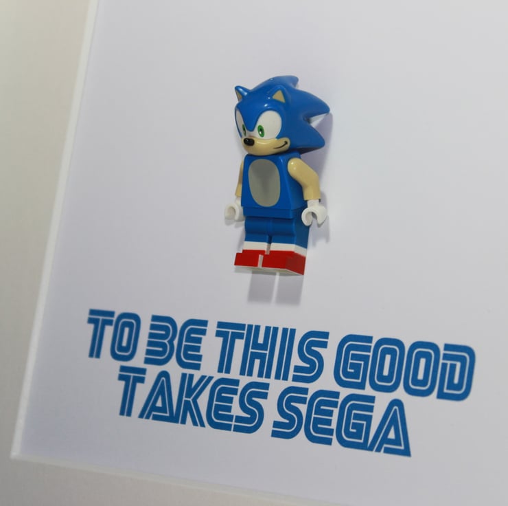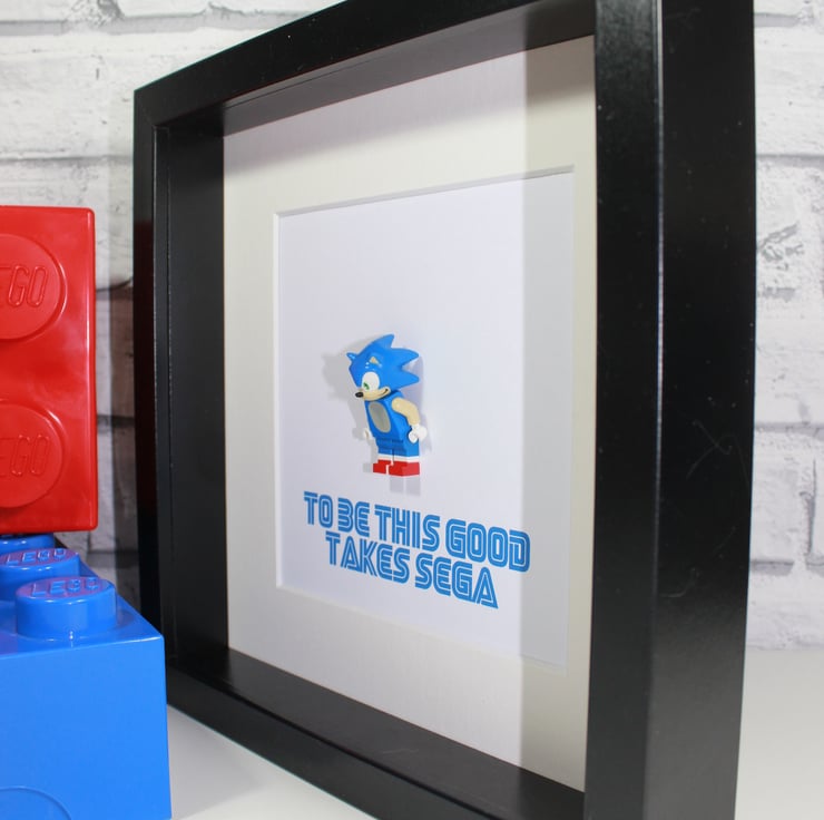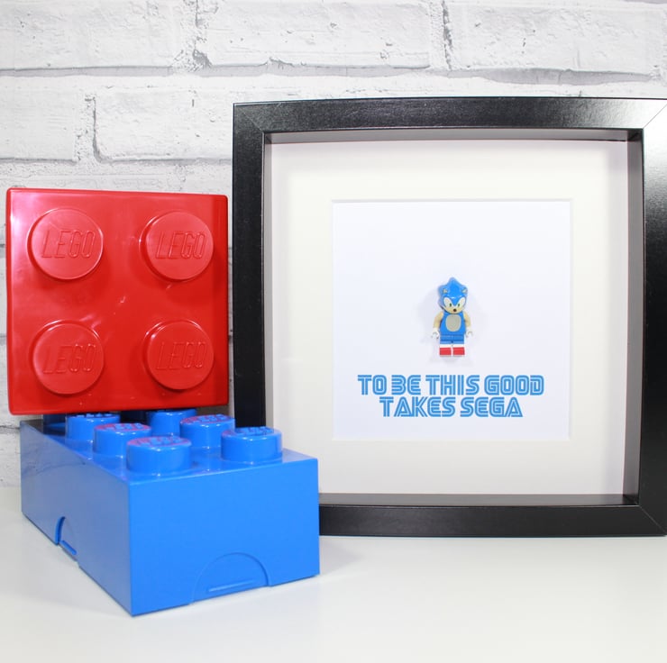 Our latest offering is a tribute to the awesome blue hedgehog made famous by Sega - ladies and gentlemen please welcome Sonic the Hedgehog! If you are of a certain age you will have fond memories of playing this on the Megadrive - back when games controllers had to be attached to the console and TVs were never really bigger than 21". We have mounted this awesome original Lego minifigure in a deep box frame and teamed him with a famous strap line from Sega - "To be this good takes Sega"
