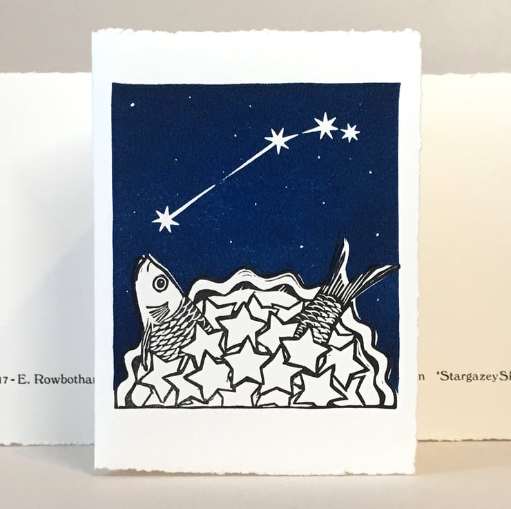 Hand-printed linocut Cornish Star sign birthday greetings card, with info on the back hand-set in old letterpress, hand inked & printed on my ancient Press.