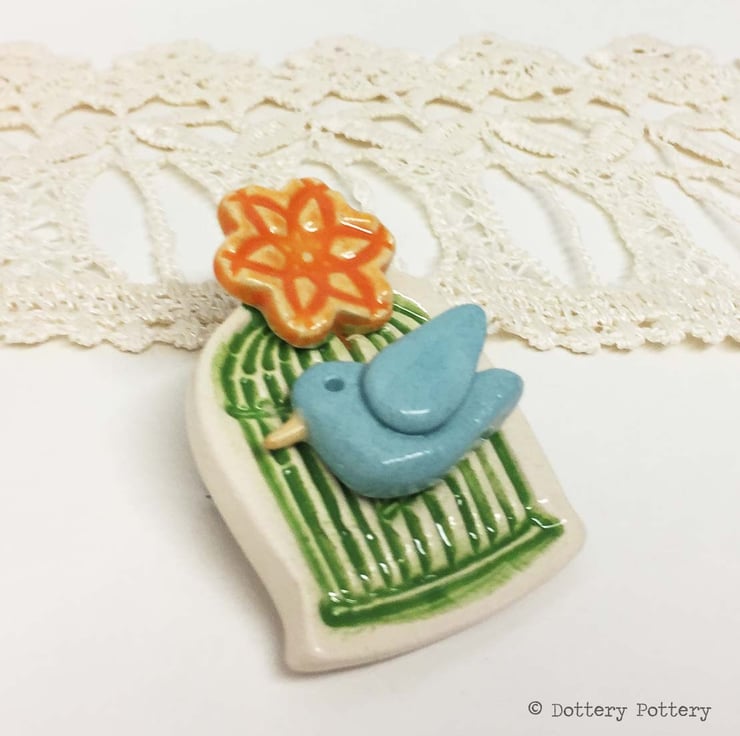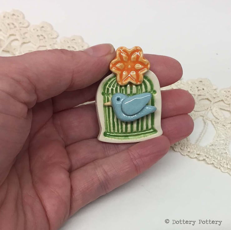 This cute little bird cage brooch is made from white earthenware clay and twice fired to a top temperature of 1100 degrees.