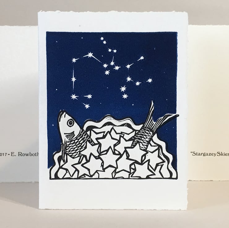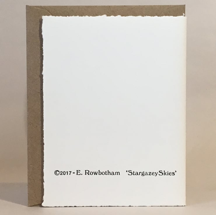 Hand-printed linocut Cornish Star Sign greetings card, with info on the back hand-set in old letterpress, hand inked & printed on my ancient Press.