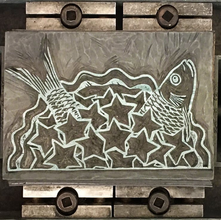 Hand-printed Cornish linocut birthday greetings card, with info on the back hand-set in old letterpress, hand inked & printed on my ancient Press.