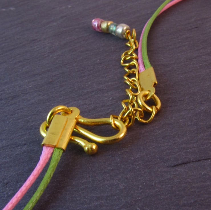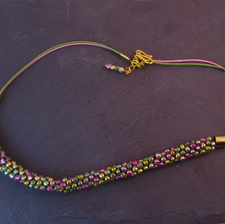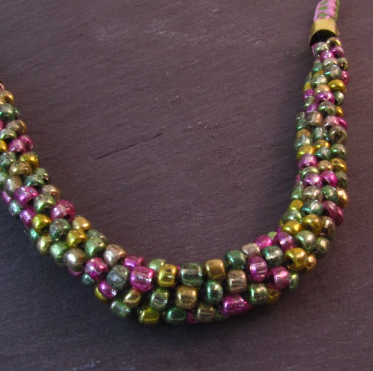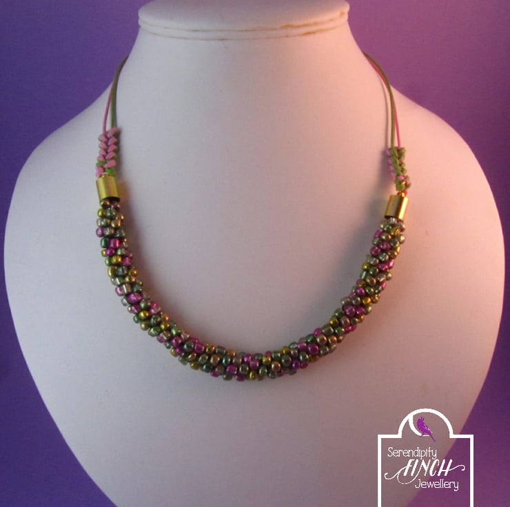 This is a stunning pink green beaded kumihimo necklace. It is created with glass seed beads, green wax cord, pink wax cord and gold plated copper. This is a beautiful necklace that will add colour to any outfit. Perfect for Spring or Summer.