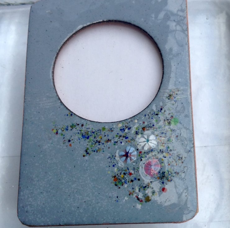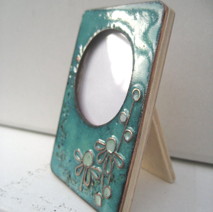 This lovely photo frame measures 50mm x 70mm. It is made from 1.2mm pure copper and I have enamelled the front , approximately 5 times firing to 800 degrees C. I have added glass flowers,which I have fired fusing into the molten enamel.