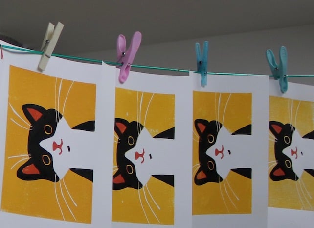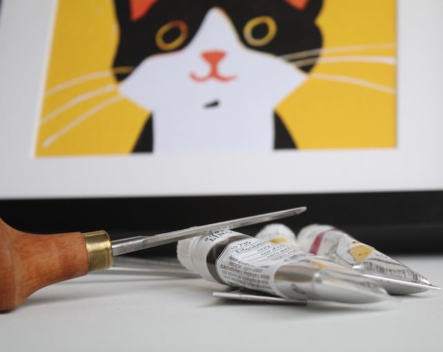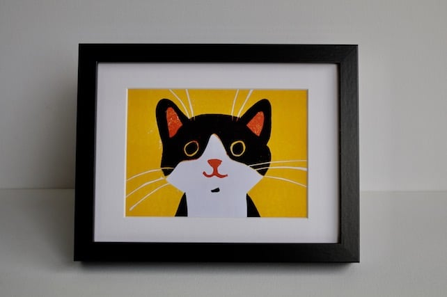 This linocut is printed on quality paper using water based inks. The picture measures 15.5cm x 10cm and the frame measures 26cm x 20cm. A perfect gift for that cat lover in your life!